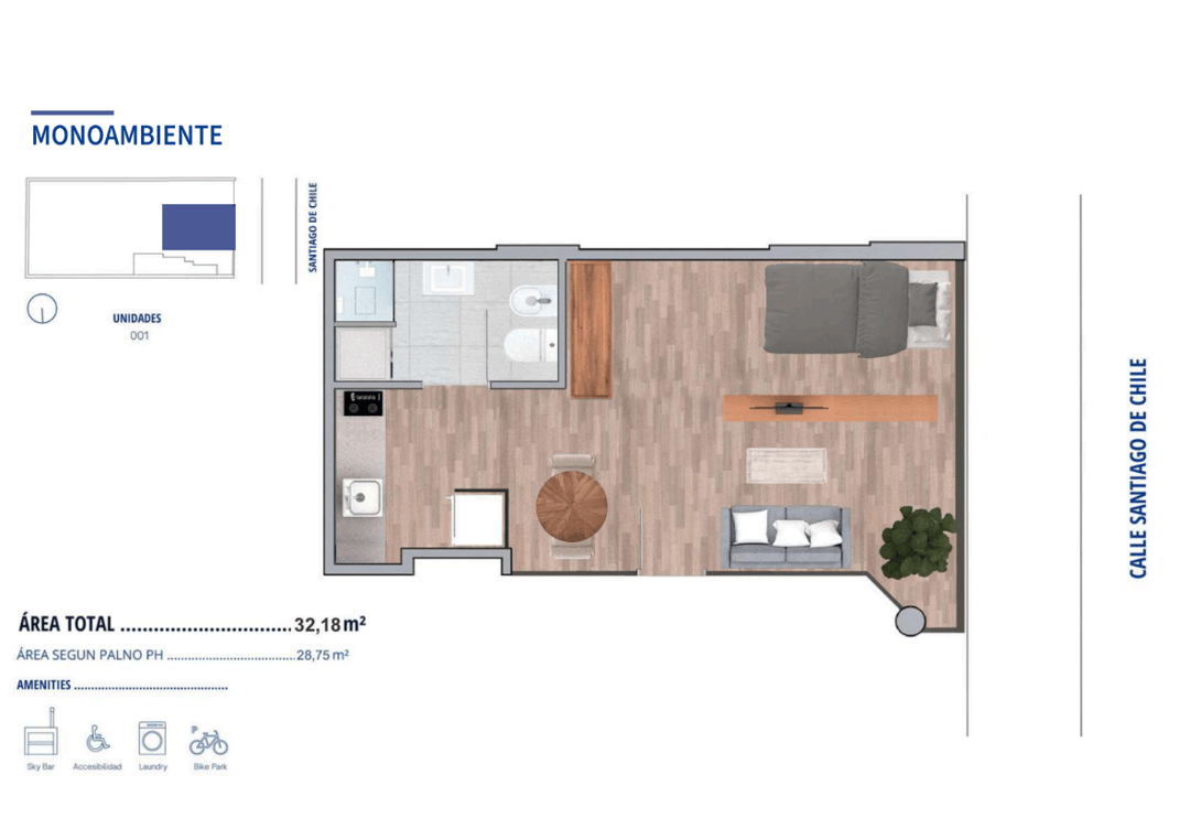 Este monoambiente se encuentra en planta baja al frente, con orientación Este. Ofrece una distribución cómoda, funcional y muy luminosa. Cuenta con kitchenette y baño completo.