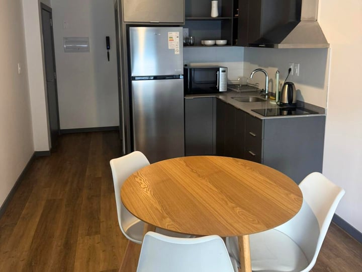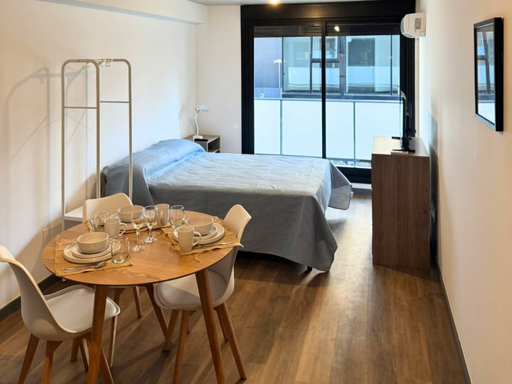 Se alquila totalmente equipado y amoblado, listo para mudarte: cuenta con cama matrimonial, mesa con sillas, mueble de guardado, aire acondicionado, kitchenette con electrodomésticos y vajilla completa.
