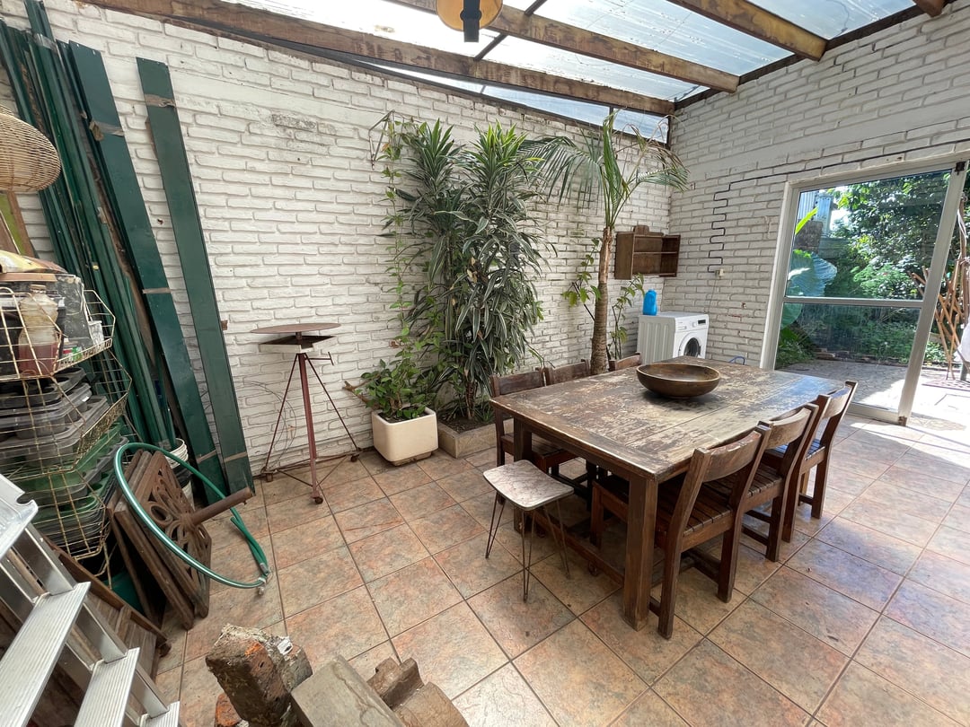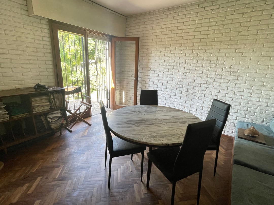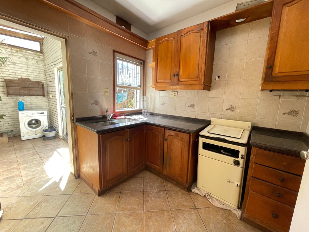 Cocina con muebles bajo y sobre mesada con salida a patio techado el cuál se puede utilizar también como comedor
