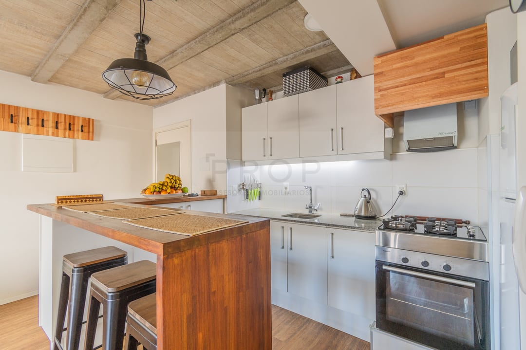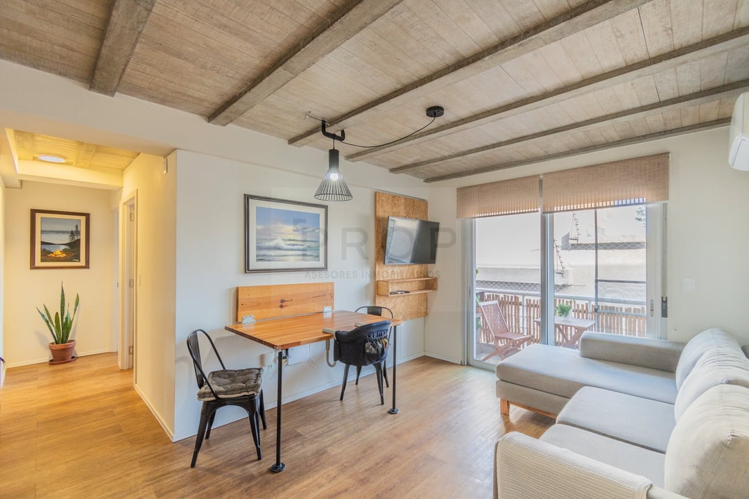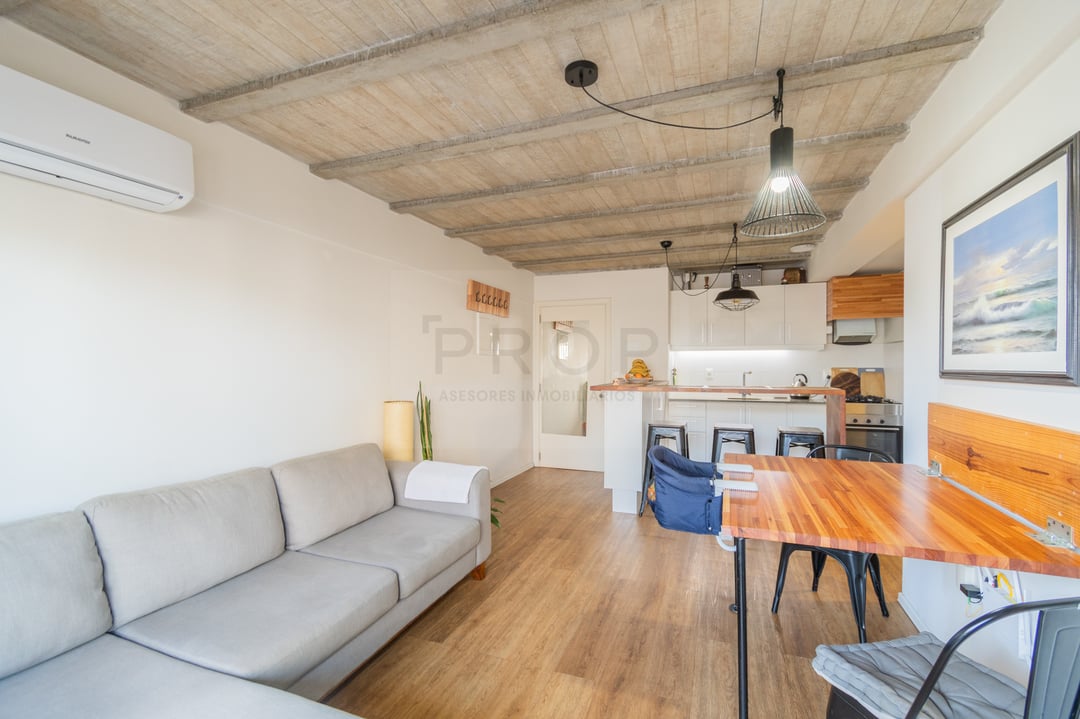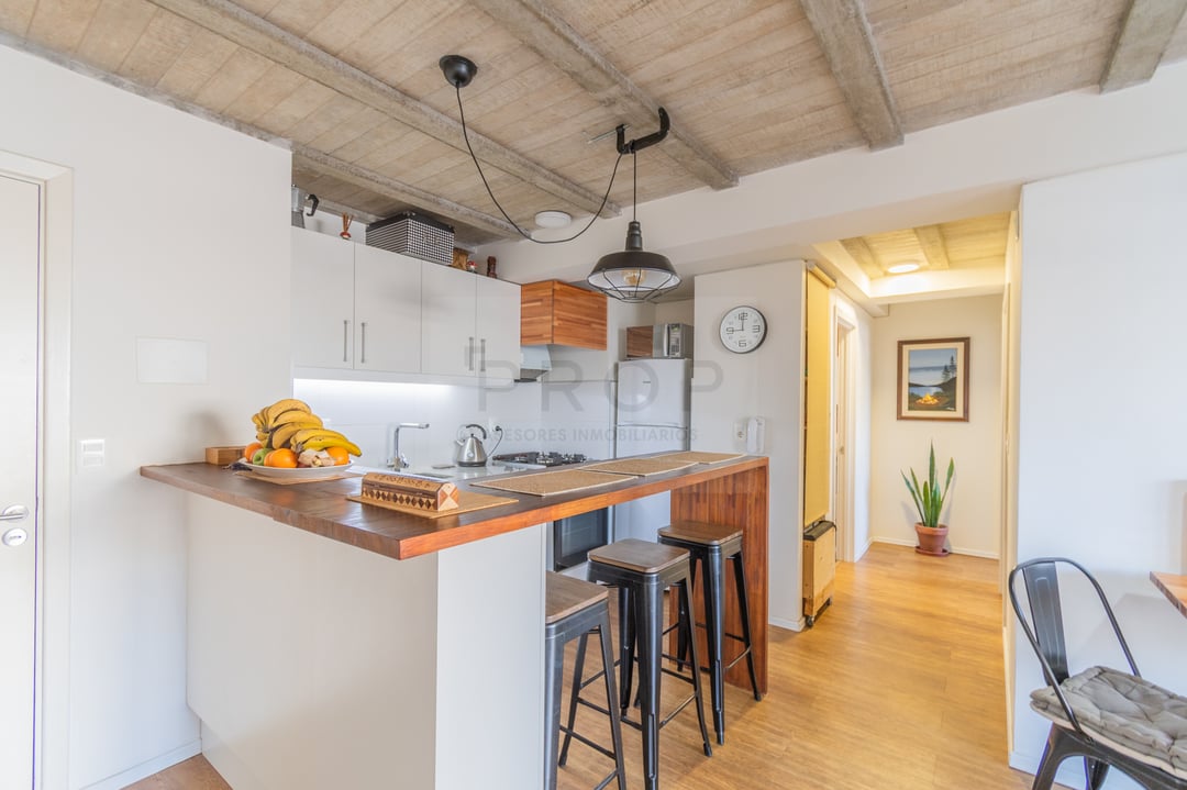 Living comedor con acceso a la terraza, cocina integrada con barra separadora, dos dormitorios con placares y un baño completo con instalación prevista para calefón y lavarropas.