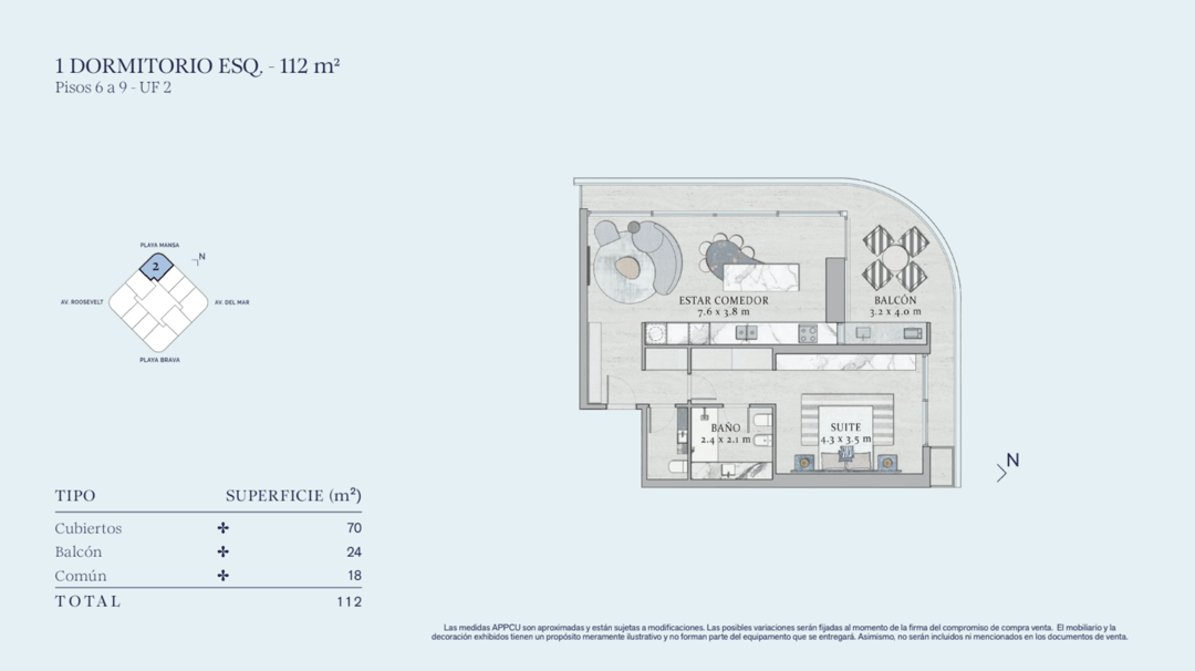 Descubra este excepcional apartamento de esquina de 1 dormitorio, diseñado para maximizar la luz natural y el espacio, sumando un total que supera los 100 m².