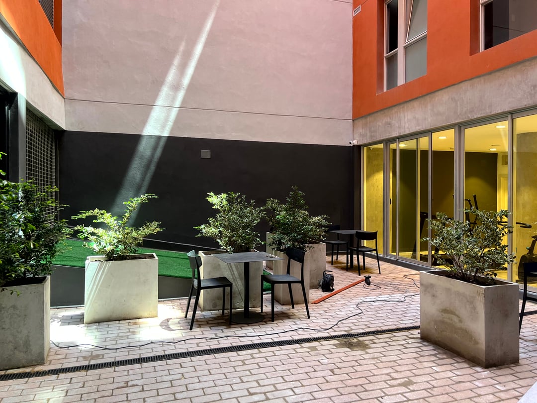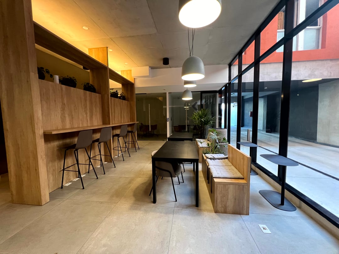 Espacio de coliving: Amplio salón de usos múltiples con baño y kitchenette, con kit de control de iluminación de los espacios, audio y video ideal para reuniones o eventos.
