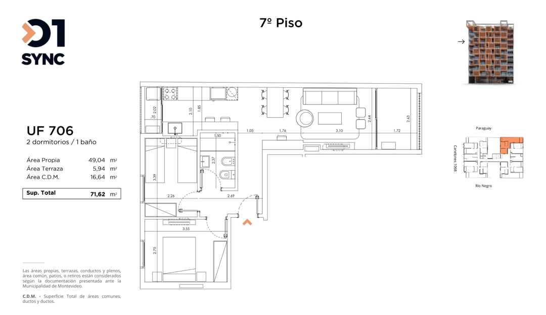 ¡Venta Apartamento 2 dormitorios en 01 SYNC a estrenar! Ubicado en excelente punto, en el límite de Barrio Sur y Centro. A pasos de la Rambla, Cordón y Ciudad Vieja.