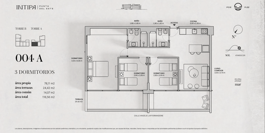 INTIPA: Apartamento de 3 dormitorios con distribución amplia y funcional. El área social se compone de living comedor con salida a una terraza de uso exclusivo, acompañado por cocina definida. El sector íntimo cuenta con un dormitorio principal y dos dormitorios adicionales, servidos por dos baños completos.