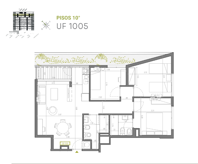 Apartamento de 3 dormitorios y 2 baños. Piso 10° al contrafrente. Living comedor con terraza al frente y cocina semi definida.