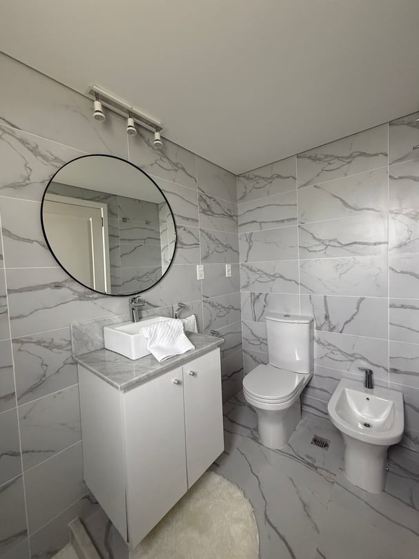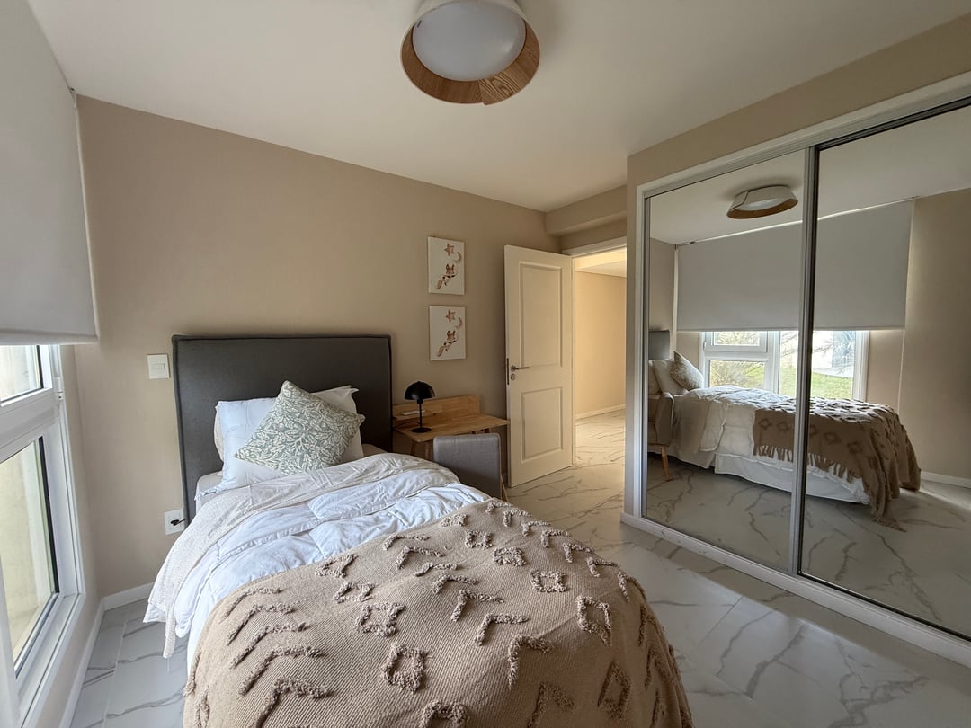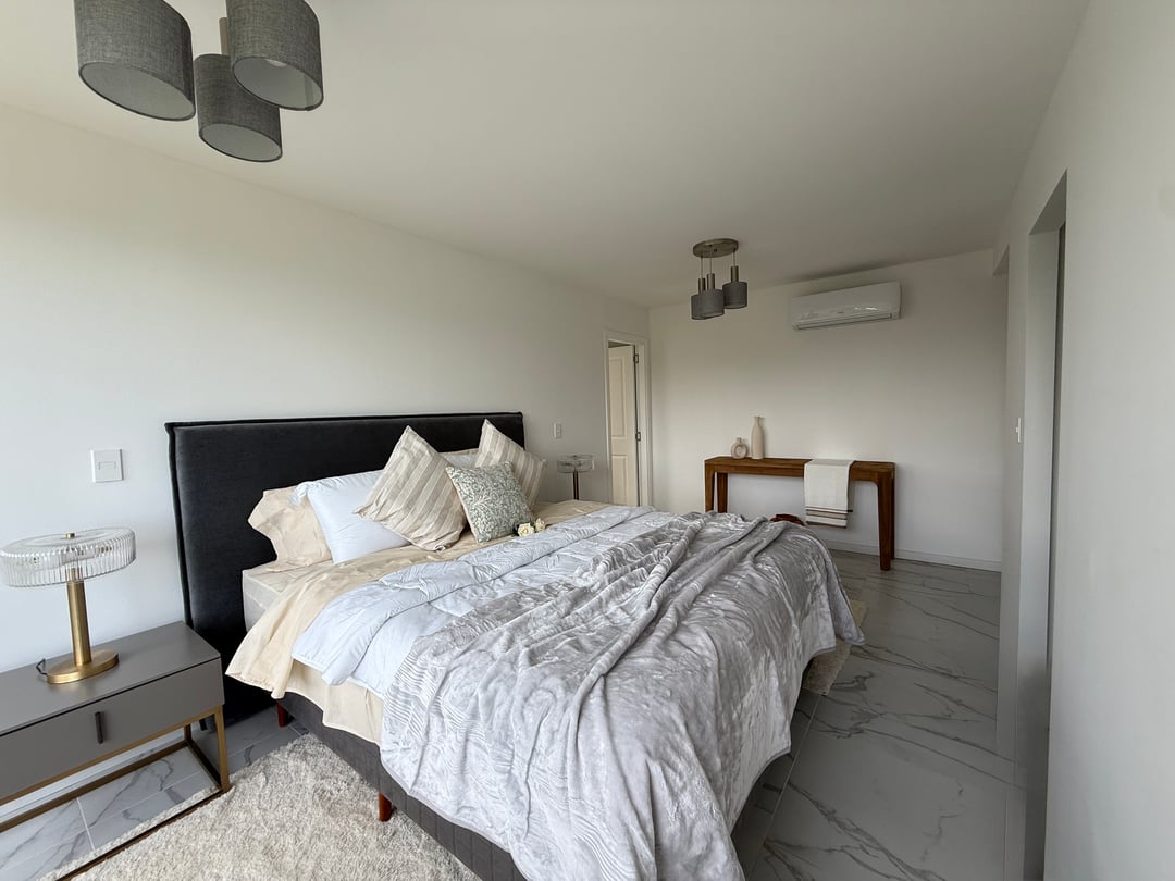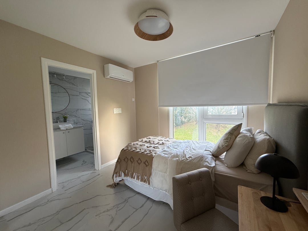 La zona privada se ubica a la derecha, comenzando con un hall de distribución. Este distribuye al práctico baño social, un dormitorio en suite y, al final del pasillo, la suite principal que es un verdadero refugio con su amplio vestidor y baño privado. Esta separación de ambientes garantiza tranquilidad absoluta para el descanso.