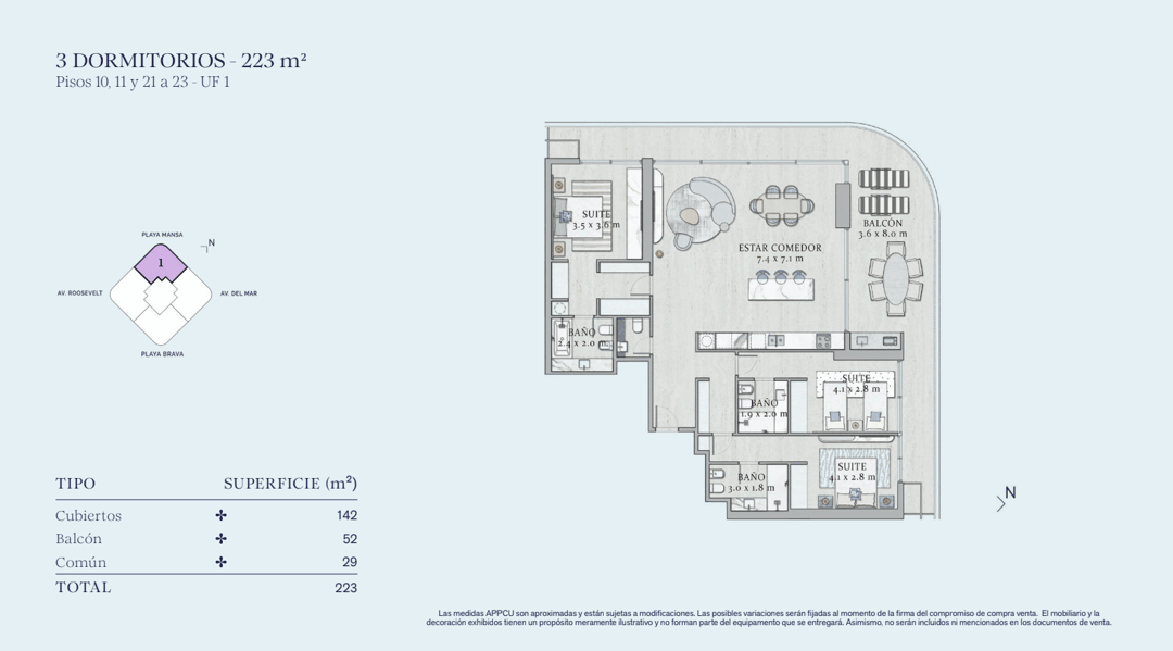 El apartamento ofrece una distribución inteligente con tres dormitorios completos. La Suite principal es un verdadero refugio, con generosas dimensiones y un completo baño en suite. Las otras dos Suites son igualmente cómodas y luminosas, cada una con su propio baño completo.