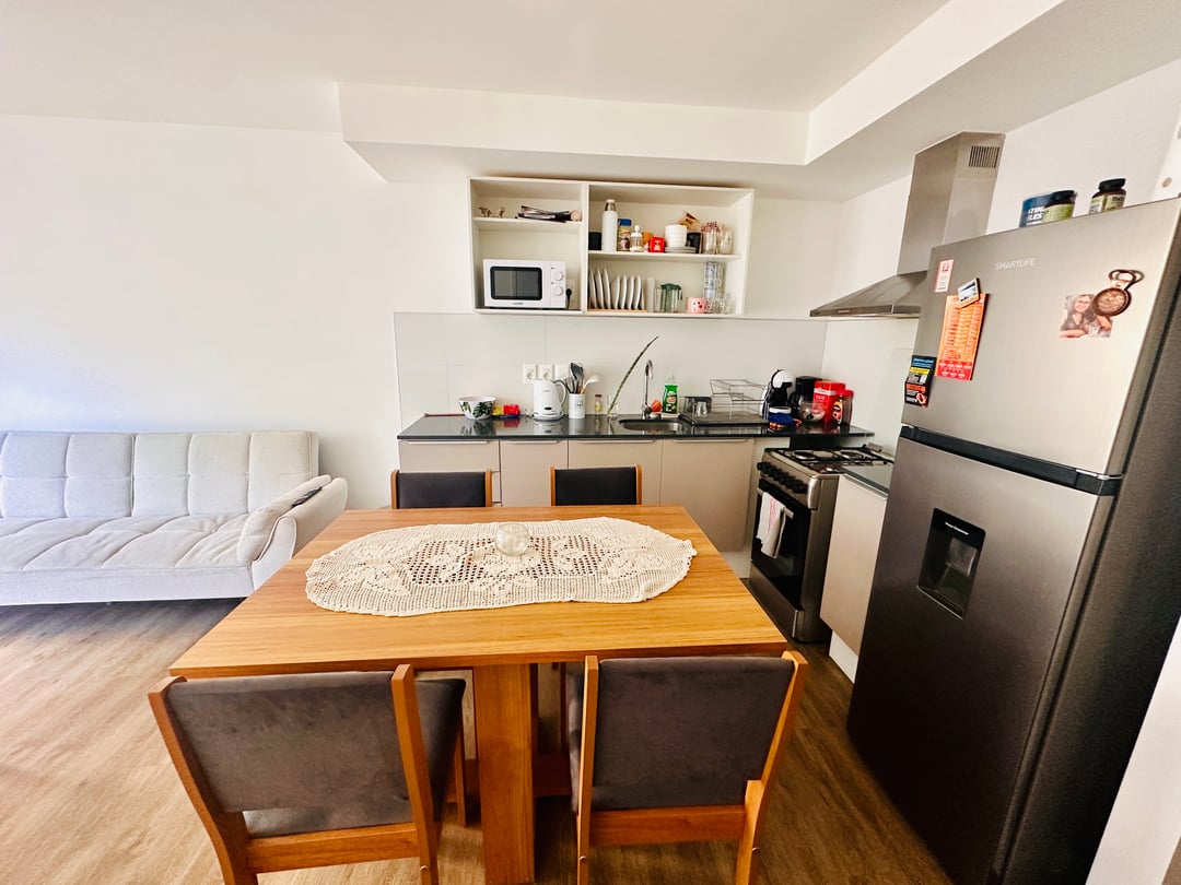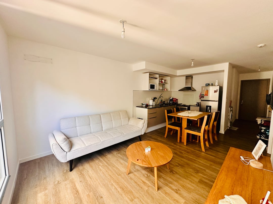 Cocina integrada con amplios muebles sobre y bajo mesada. Dormitorio luminoso con balcón.