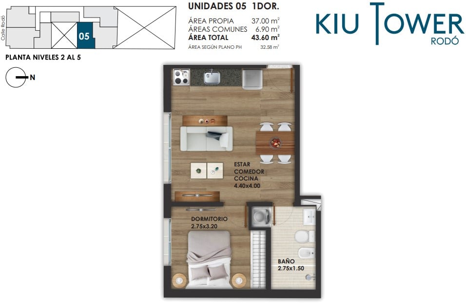 Cuarto piso al contrafrente con orientación norte. Living comedor espacioso con cocina integrada. Un baño completo.