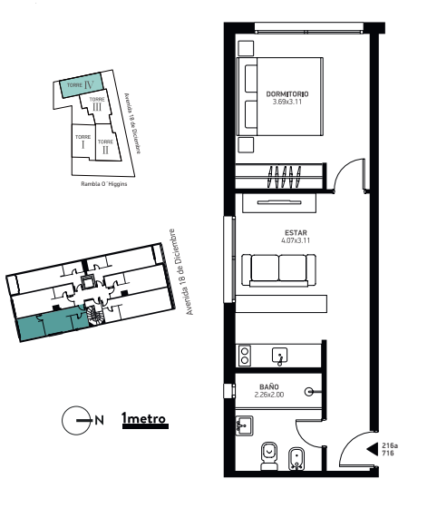 Apartamento de 1 dormitorio en torre 4, en el 5to piso al contrafrente con orientación suroeste.