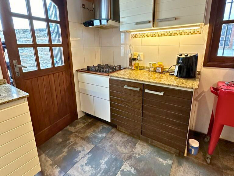 En planta baja ( 40 m2) se desarrolla amplio living comedor con excelente iluminación natural , hermosa estufa a leña , cocina definida de gran tamaño con office con muebles bajo y sobre mesada.