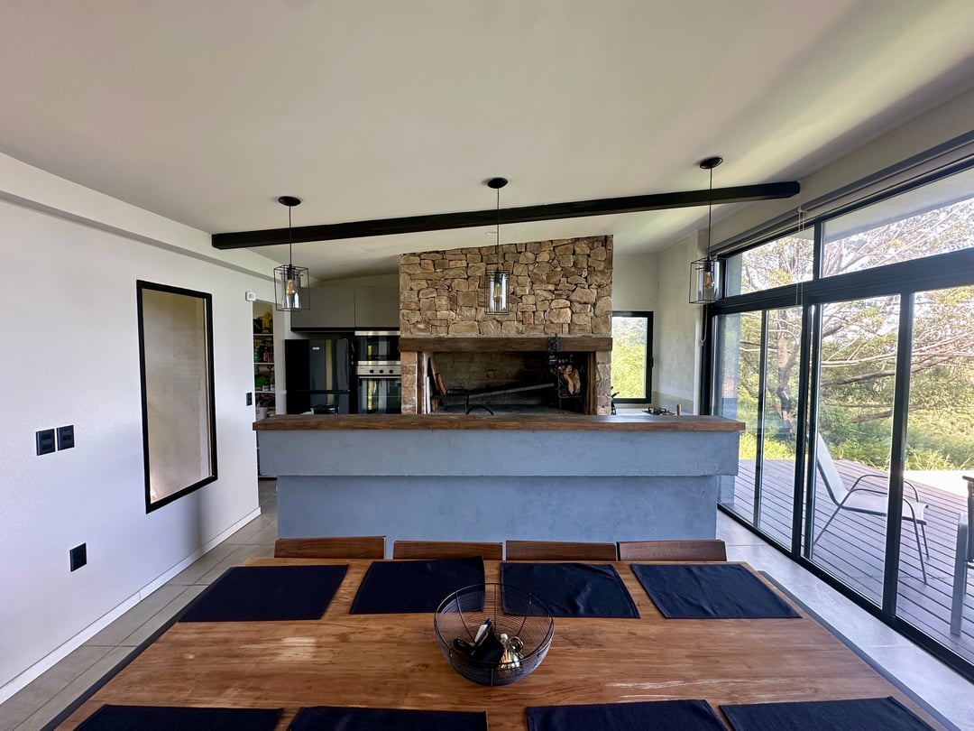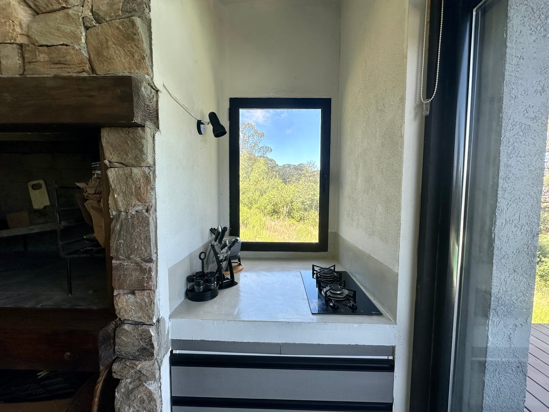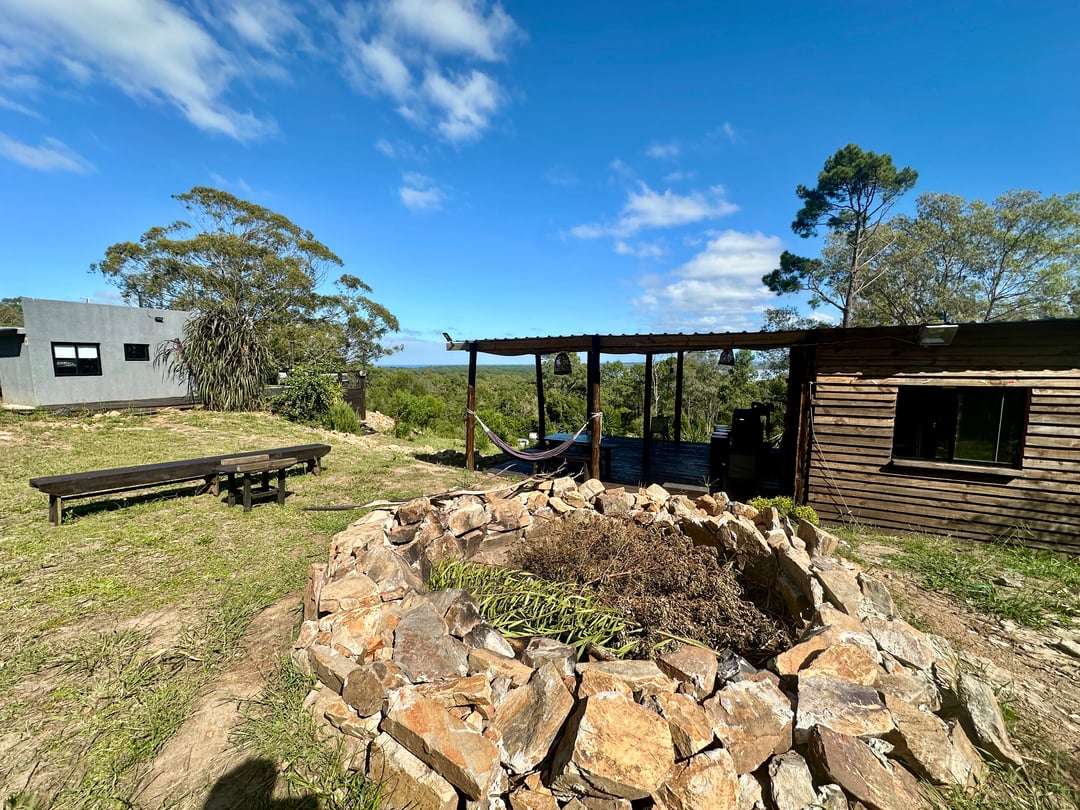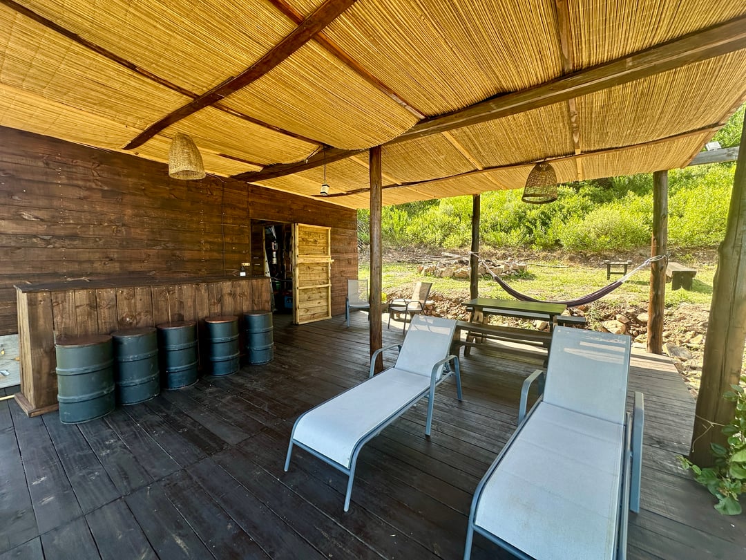 Área exterior con fogón, barra y deck de madera, un rincón soñado para atardeceres y reuniones al aire libre.