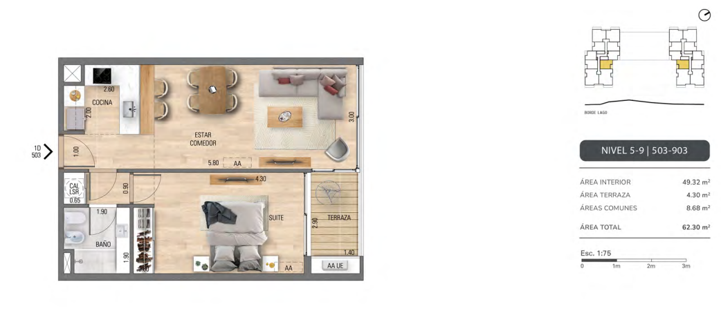 Situado en el quinto piso con orientación Este, el apartamento cuenta con una distribución funcional que incluye un amplio living comedor con una cocina semi-integrada mediante barra. El dormitorio principal es espacioso y cuenta con acceso a un balcón, que también se puede acceder desde la cocina, brindando un espacio adicional para disfrutar de las vistas.