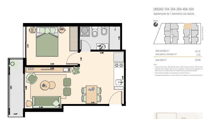 La unidad se encuentra en el primer piso, cuenta con living comedor con cocina integrada y salida a balcón, un dormitorio definido y un baño completo. Espacios bien resueltos, funcionales y con buena luz natural. La unidad se entrega con aire acondicionado en el living y dormitorio.