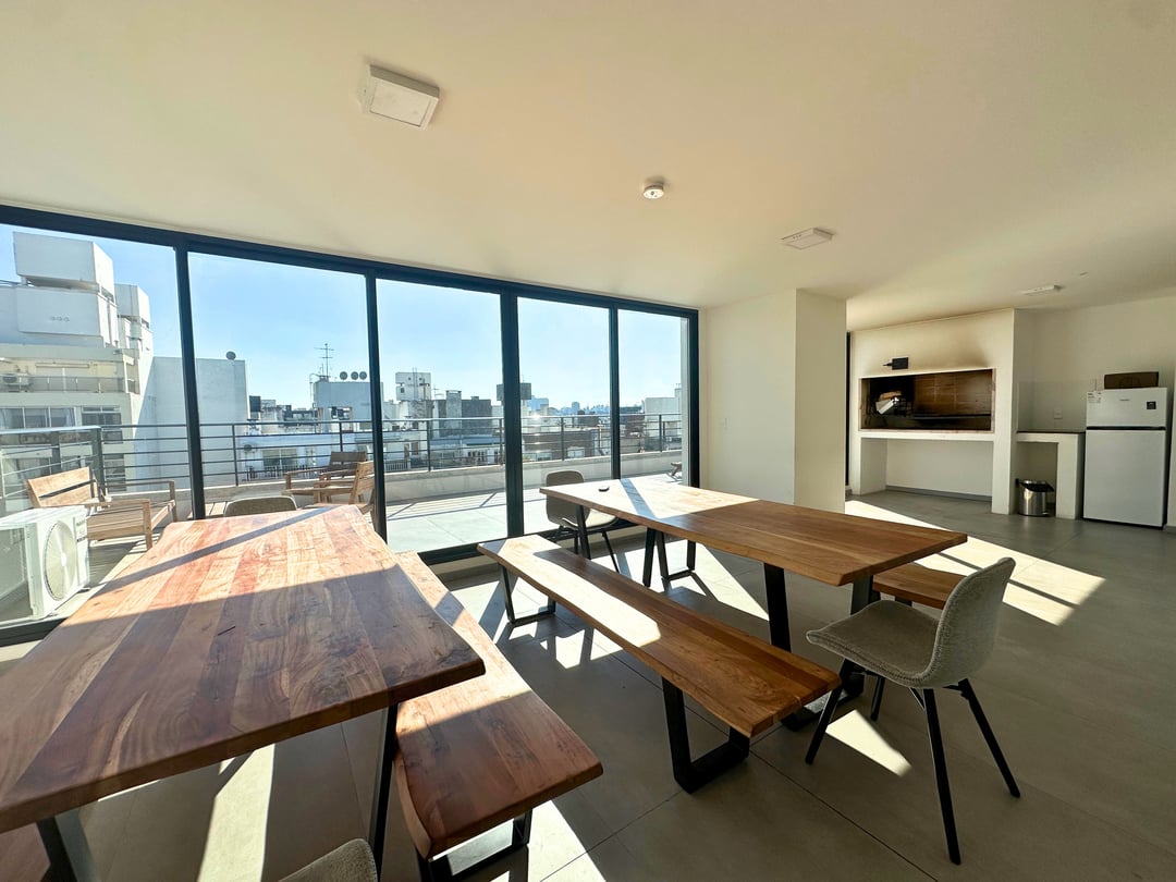 El edificio, de 10 pisos, se destaca por su cuidado diseño arquitectónico y terminaciones de alta calidad. Ofrece excelentes amenities: rooftop en el piso 11 con salón de usos múltiples, solárium y barbacoa, gimnasio in-out y lavadero.