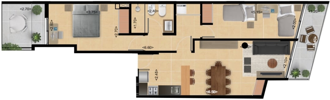 Dos cómodos dormitorio, uno al frente con salida al balcón. El principal se ubica al fondo con terraza exclusiva.