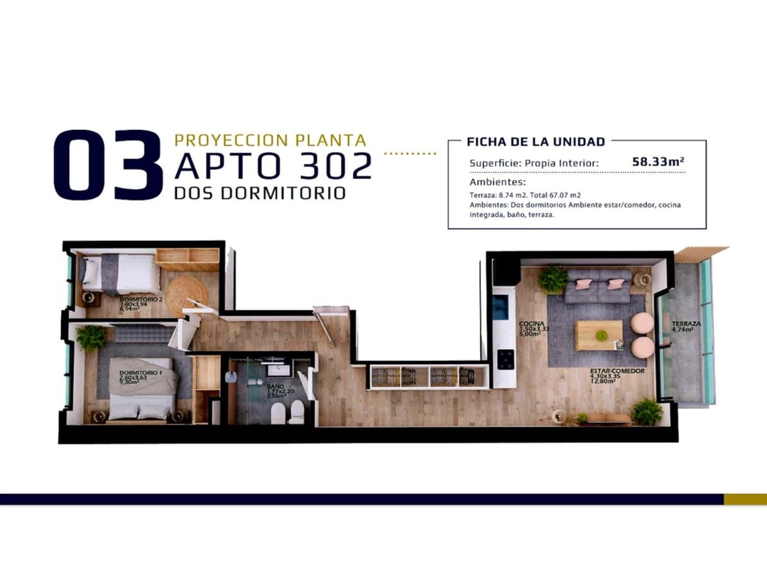 La unidad se encuentra en el tercer piso al frente con orientación Oeste, cuenta con living comedor con cocina integrada al frente con salida al balcón.