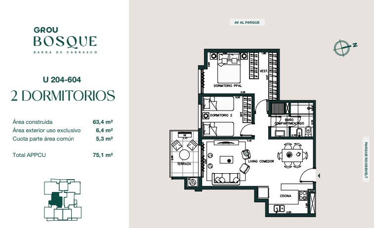 Apartamento en venta de 2 dormitorios en Grou Bosque - Torre II, ubicado en Av. a la Playa y Av. al Parque. A pasos del imponente Parque Roosevelt y de la playa.