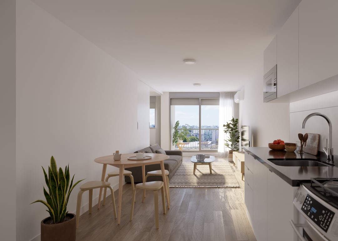 Contará con amplia terraza abierta al oeste, salón cerrado con parrillero y equipamiento de uso común, Kitchenette, servicio, depósito independiente y lavadero.