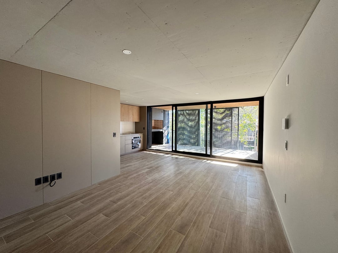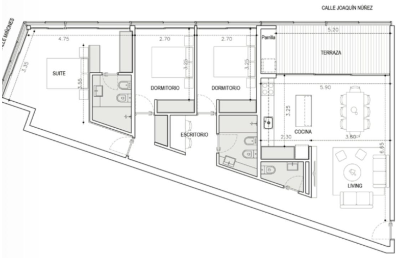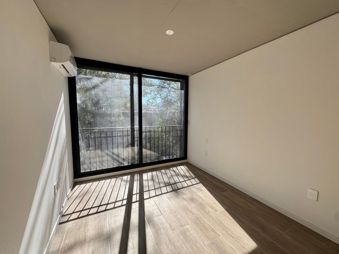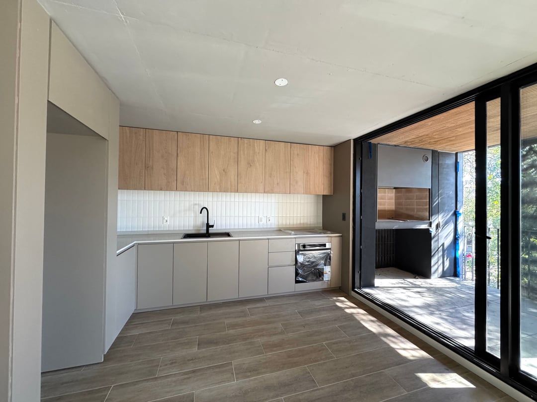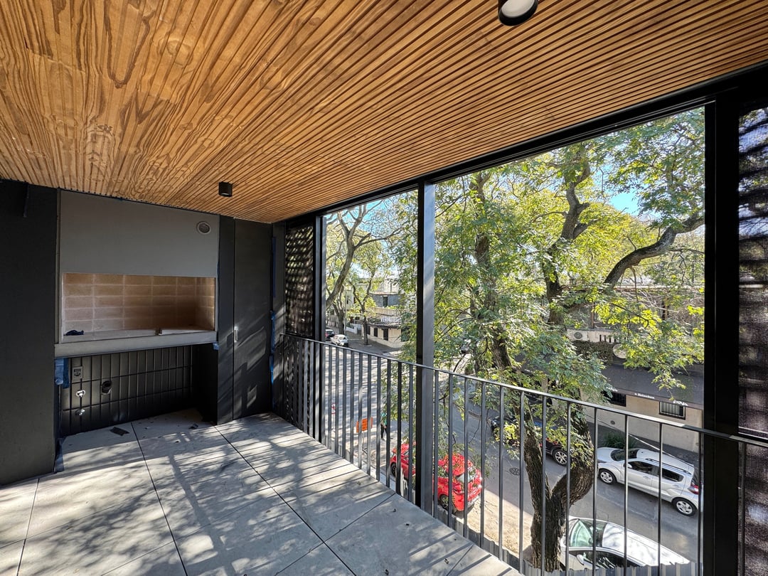 Primer piso esquinero con frente a ambas calles. Calidad en diseño y construcción. Living comedor con cocina integrada. Amplia terraza al frente con parrillero propio. Baño social.