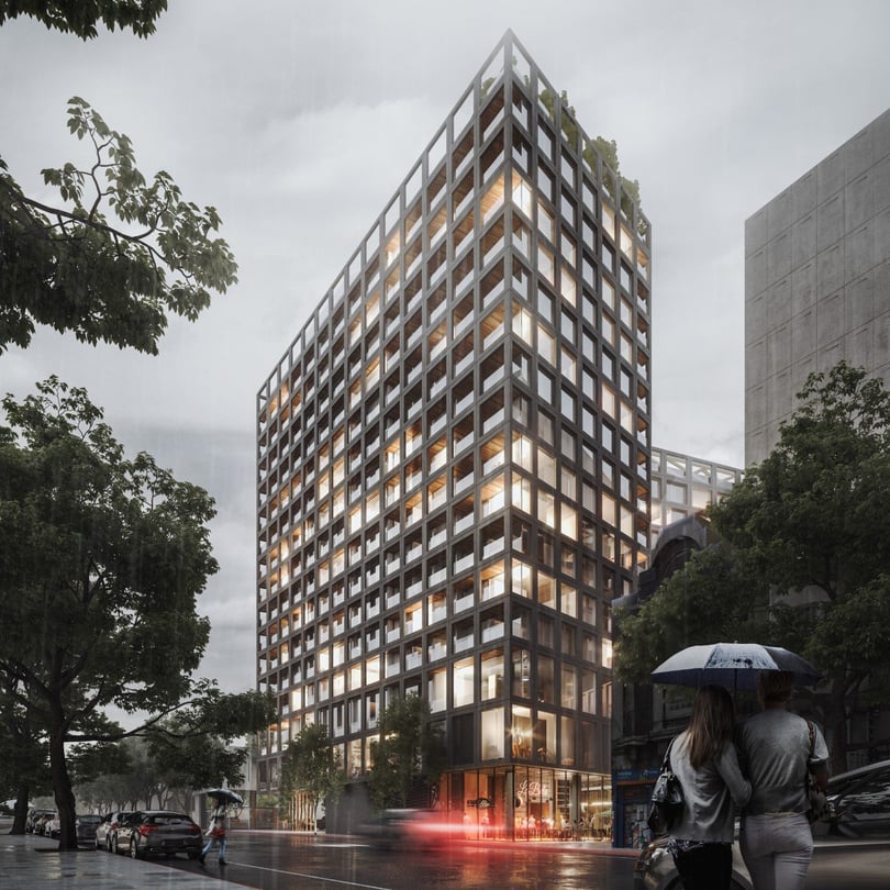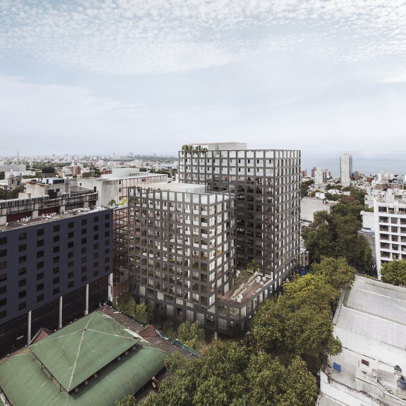 Tres piezas de distintas alturas nos sorprenden en un conjunto que aporta gran calidad espacial y ambiental a una manzana clave de Montevideo. Atravesada de norte a sur y de este a oeste con un paseo peatonal, con viviendas, locales comerciales, un hotel urbano y el espacio público.