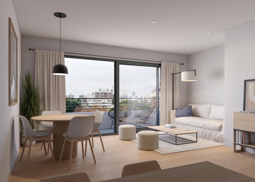 Living comedor con cocina integrada mediante barra. Salida a terraza.