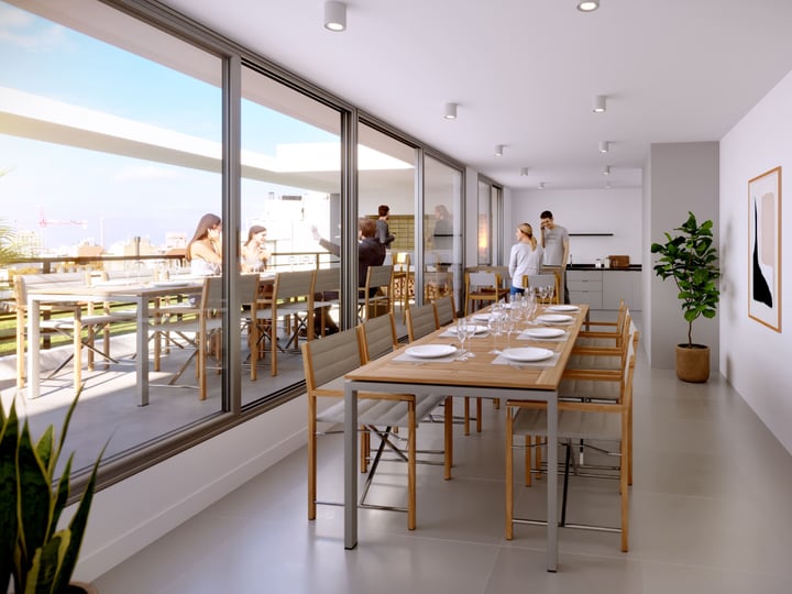 El edificio tiene 10 pisos, con un total de 88 unidades, todas con terraza y buena orientación. Dispone de 44 plazas de garaje ubicadas en planta baja y subsuelo, hall de acceso equipado y 2 ascensores de última generación. En la azotea se encuentran 2 barbacoas de uso común, ambas equipadas con parrilleros, cocina y baños.