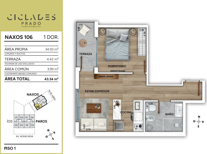 Venta de apartamento de 1 dormitorio en Edificio Naxos en Ciclades Prado, s un condominio de tres edificios de planta baja y tres pisos ÍOS, PAROS y NAXOS, implementado en un predio que atraviesa la manzana y le abre frente a dos avenidas icónicas del barrio: av Agraciada y Av. 19 de abril. Cada uno cuenta con acceso propio y se comunican a nivel de subsuelo donde se ubican las cocheras.