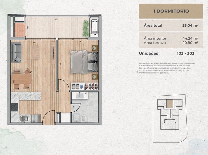 Unidad de 1 dormitorio en segundo piso con orientación Norte. Cuenta con living comedor, cocina integrada, baño completo y balcón con parrillero.