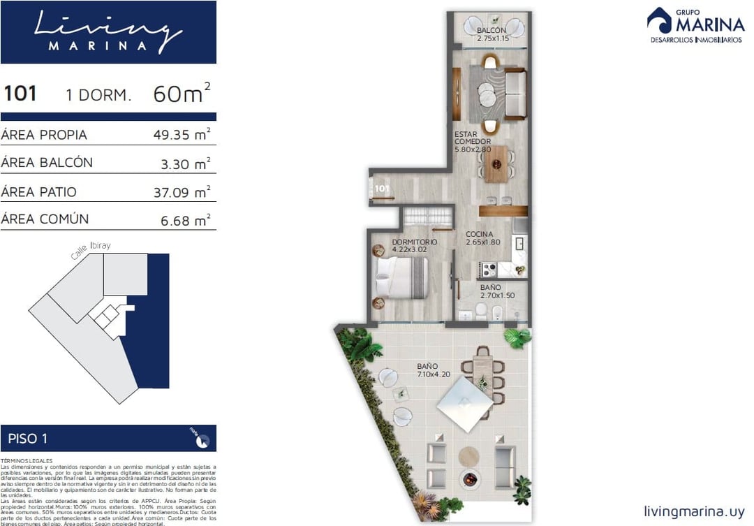 Living comedor con salida al balcón al frente. Cocina integrada.