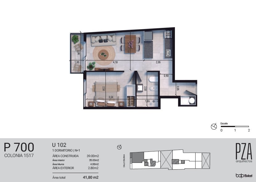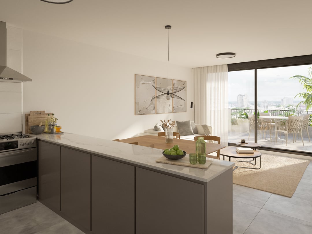 La unidad se encuentra en el primer piso al frente a la calle Colonia con orientación Oeste. Living comedor con cocina semi integrada mediante barra con salida al balcón.