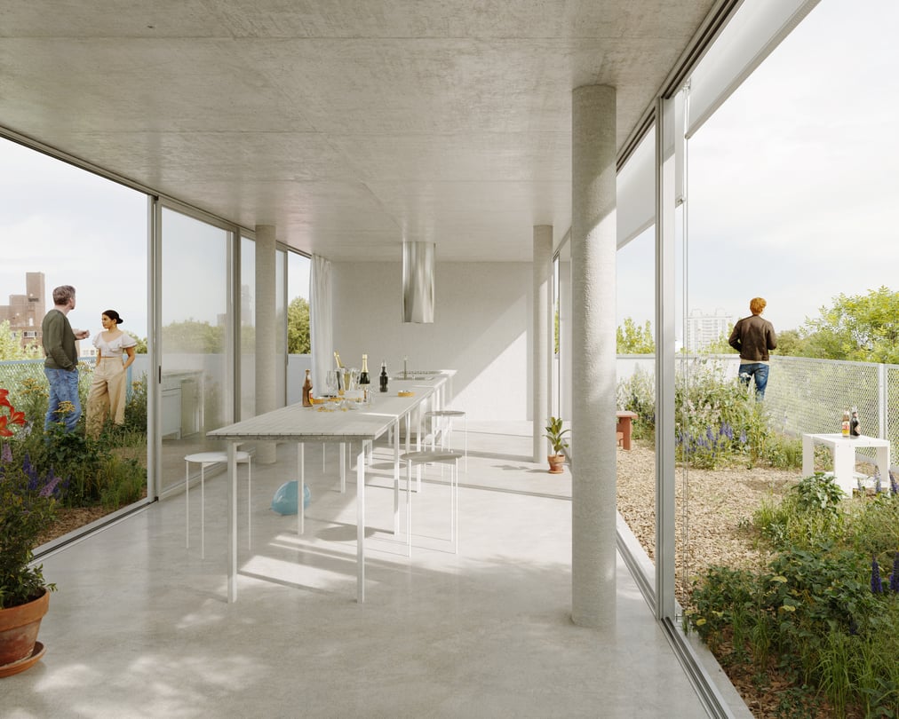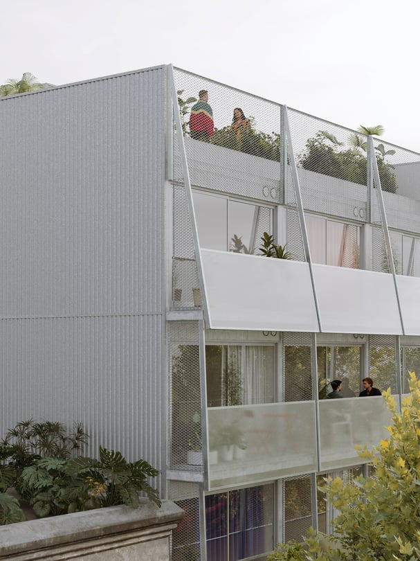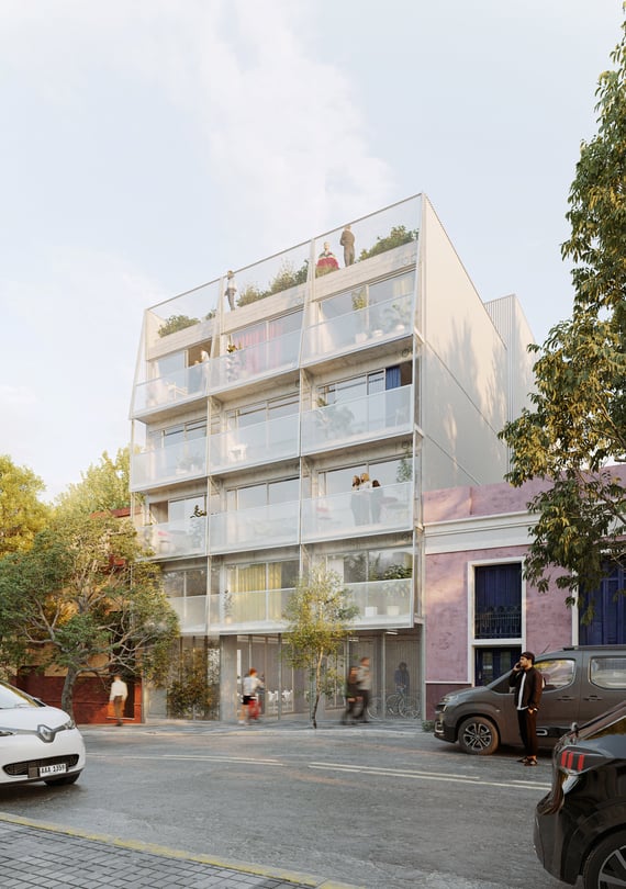 Se compone de 2 torres de 5 pisos cada una, con una serie de espacios comunes, un patio de circulación, ventilación e iluminación natural ubicado al centro del lote. Además, dos terrazas que incluyen una sala polivalente al norte y un jardín con parrilleros y vistas hacia la ciudad y el río.
