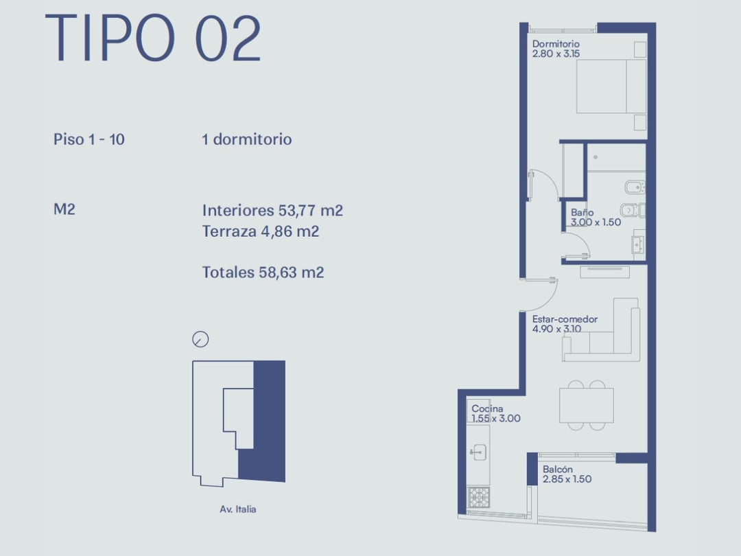 Este apartamento, ubicado en el primer piso, tiene orientación oeste y cuenta con un luminoso living-comedor con balcón y una cocina semi integrada. El dormitorio, orientado al este, es tranquilo y tiene un placard integrado. El apartamento también incluye conexión para lavarropa y preinstalación para equipos de aire acondicionado.