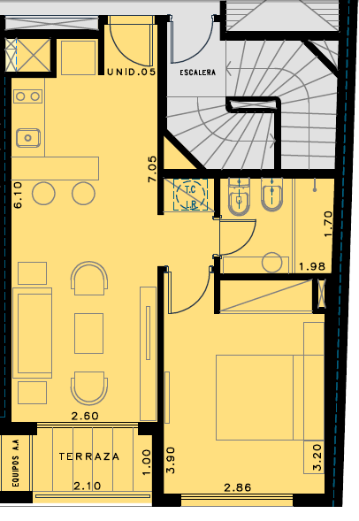 Segundo piso al contrafrente, living comedor con terraza, cocina integrada al mismo mediante barra. 1 dormitorio y 1 baño.
