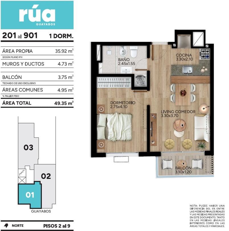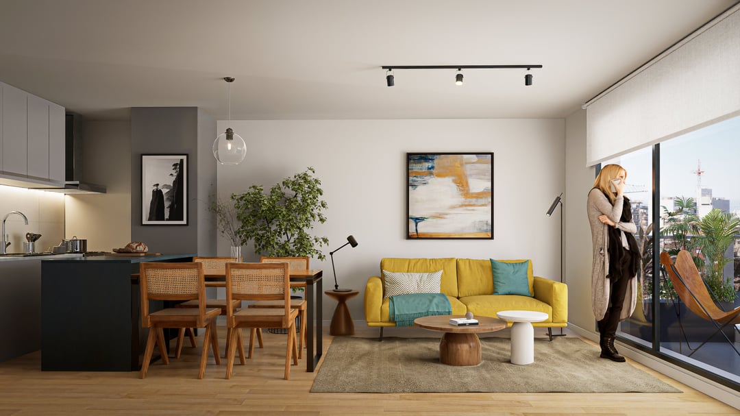 Segundo piso al frente. Living comedor con cocina semi integrada mediante barra. Cómodo balcón.