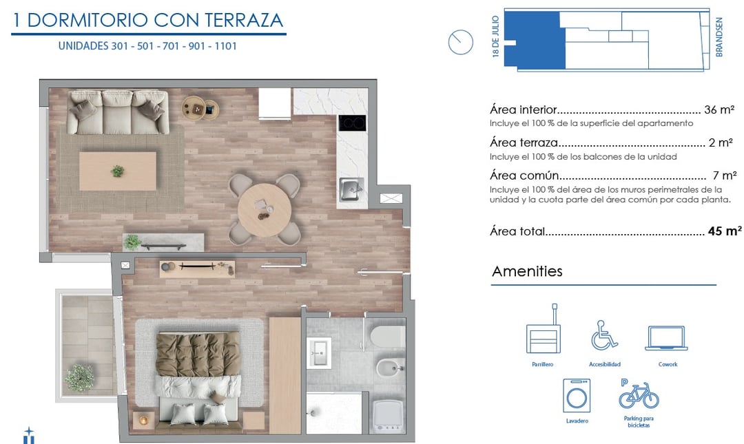 Apartamento en venta de 1 dormitorio en Torre Alba, un proyecto residencial que se alza en la vibrante Avenida 18 de Julio y Acevedo Díaz. Este edificio, con un diseño moderno, se integra perfectamente con la energía de su entorno. Es el lugar ideal para vivir conectado con todos y con todo.