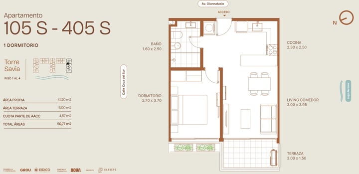 La unidad se ubica en el segundo piso al lateral con orientación Este, living comedor con cocina integrada mediante barra con salida al balcón.