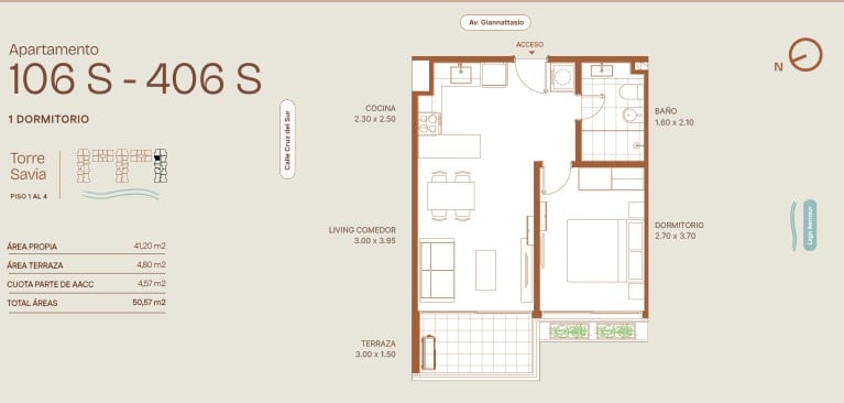 La unidad se ubica en el cuarto piso al lateral con orientación Este, living comedor con cocina integrada mediante barra con salida al balcón.