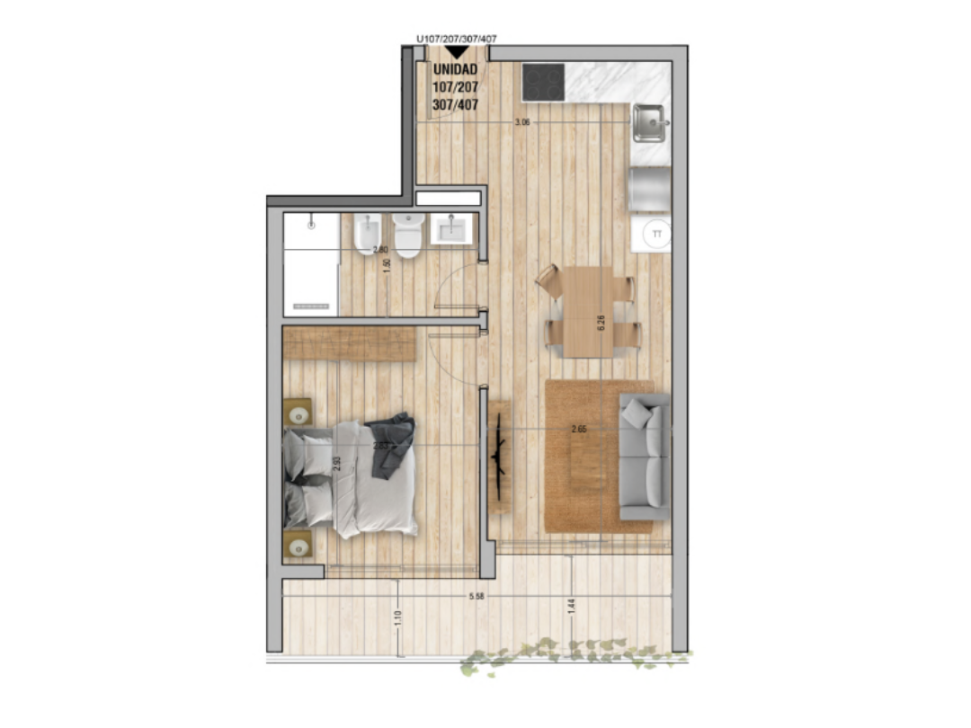 Se encuentra en un tercer piso al contrafrente, con excelente luminosidad y un amplio balcón. Cuenta con un dormitorio definido, living-comedor con cocina integrada de estilo moderno, baño completo con terminaciones de calidad y ambientes cómodos pensados para aprovechar al máximo el espacio.