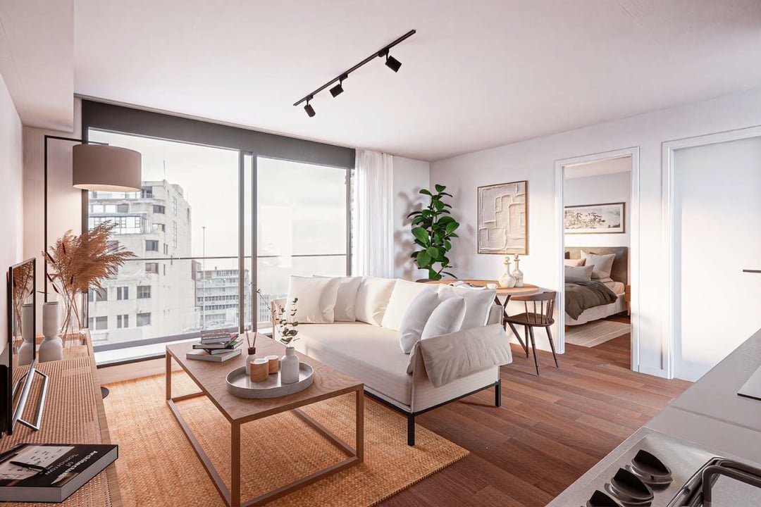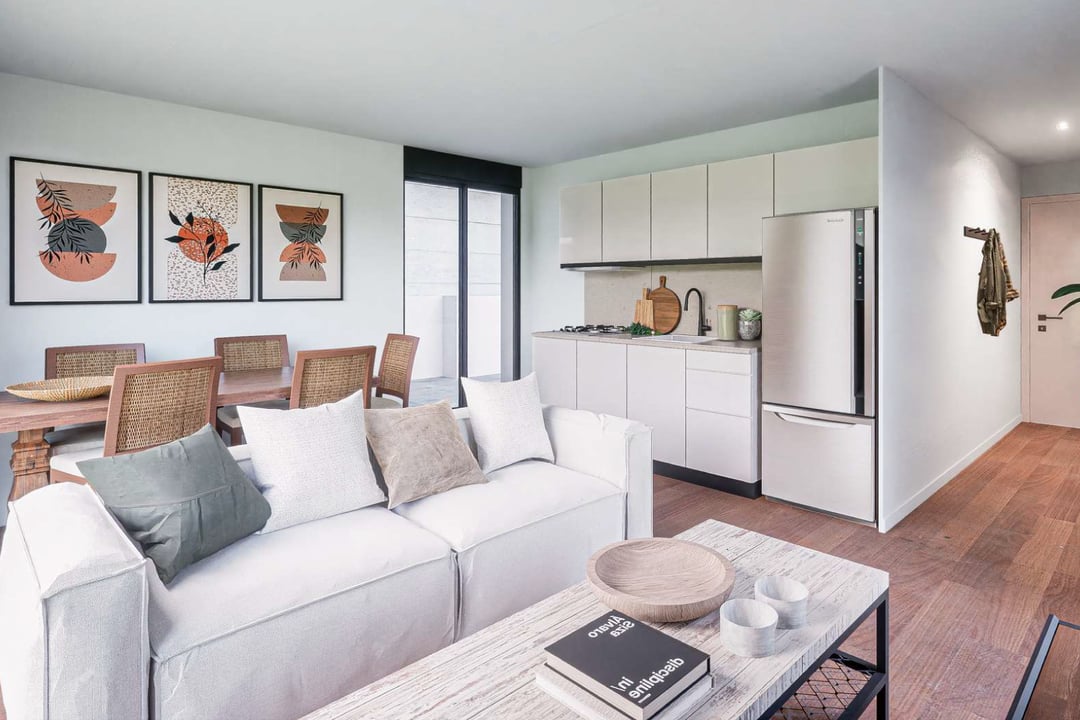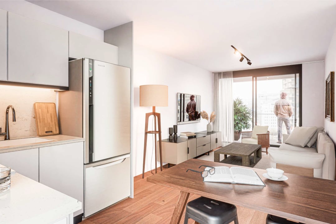 Segundo piso al frente con orientación Oeste. Living comedor con cocina semi integrada mediante barra. Salida al balcón.