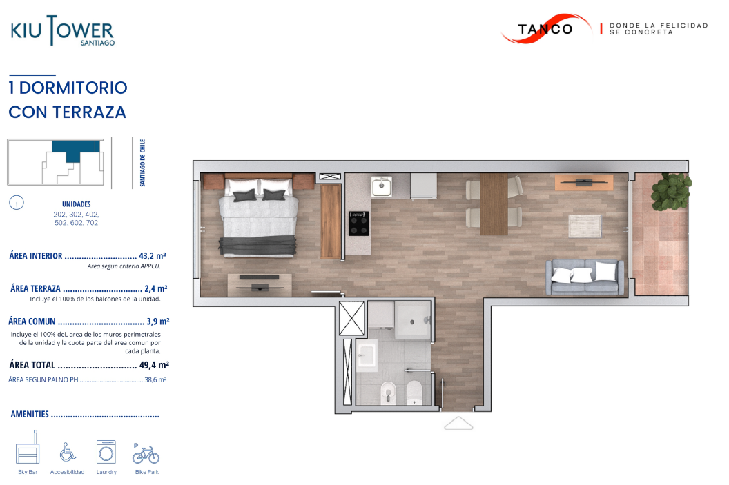 Amenities: parrillero, lavadero, solárium, espacio reservado para bicicletas.