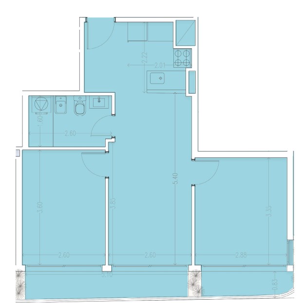 Piso 11, al contrafrente con orientación Sur. Living comedor con cocina integrada.
