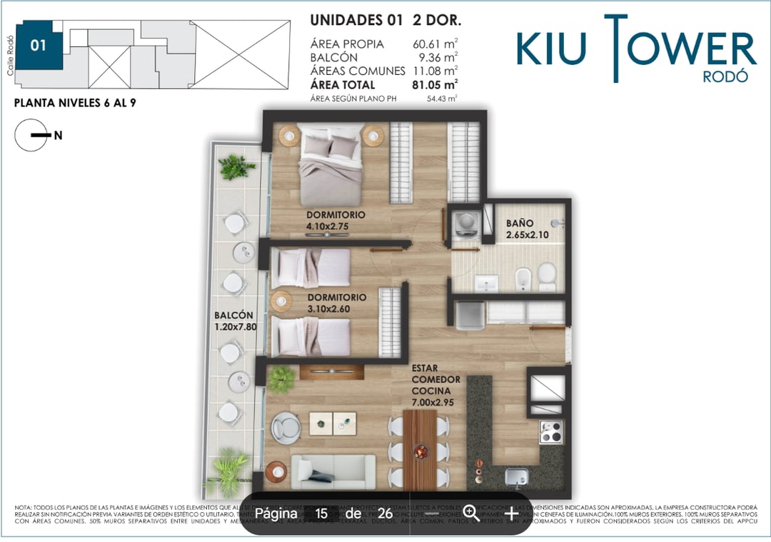 Sexto piso al frente con balcón, amplio living comedor, cocina semi-integrada, dos dormitorios espaciosos y baño completo.