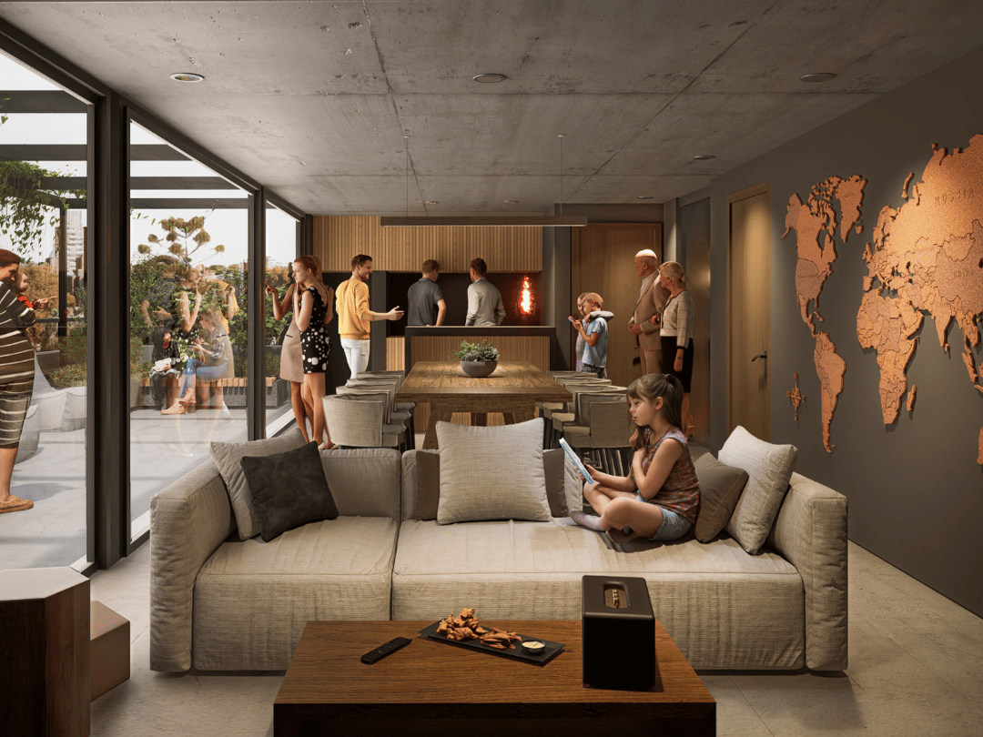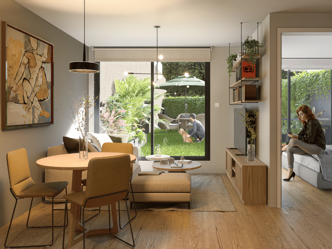 La unidad se ubica en planta baja al contrafrente con orientación Norte. Living comedor con cocina semi integrada mediante barra.