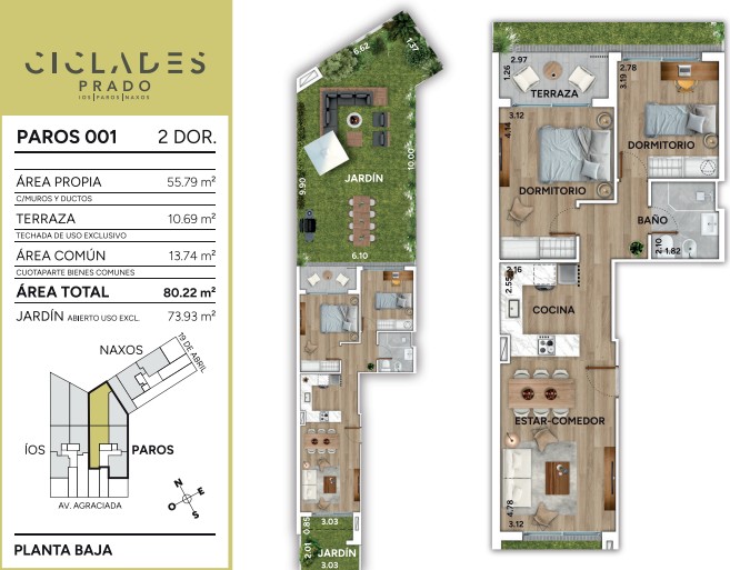 Venta de apartamento de 2 dormitorios en Edificio Paros en Ciclades Prado, es un condominio de tres edificios de planta baja y tres pisos ÍOS, PAROS y NAXOS, implementado en un predio que atraviesa la manzana y le abre frente a dos avenidas icónicas del barrio: av Agraciada y Av. 19 de abril. Cada uno cuenta con acceso propio y se comunican a nivel de subsuelo donde se ubican las cocheras.