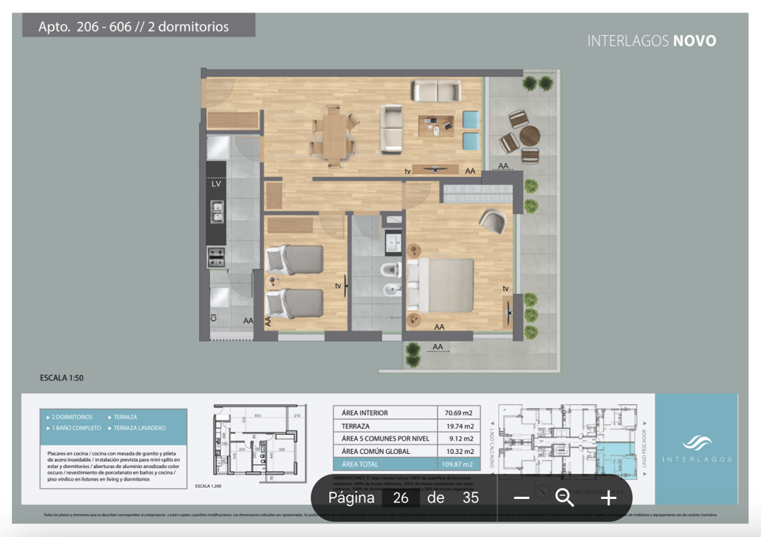 La unidad se encuentra en el primer piso al frente con vista al Lago Pescador. Dispone de living comedor al frente con vista al lago, cocina definida con terraza lavadero, dos dormitorios, y un dormitorio principal, ambos con salida a una amplia terraza.
