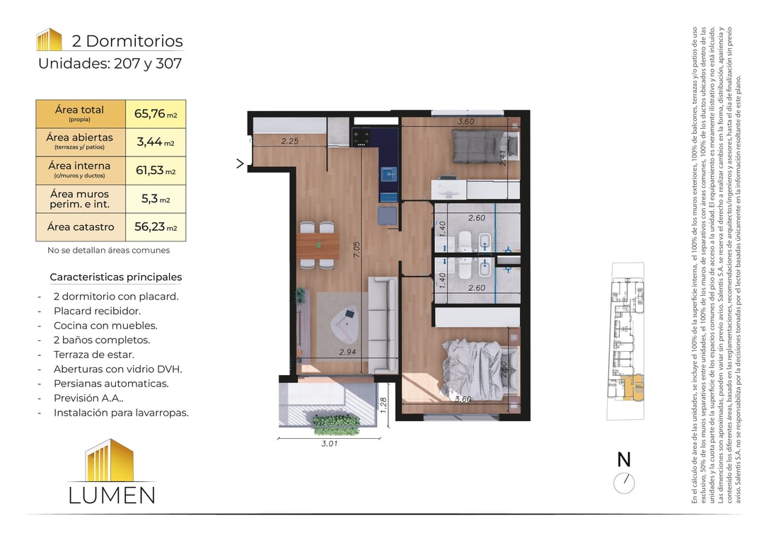 Living comedor con acceso a la terraza, cocina integrada, dos dormitorios con placares y dos baños completos.