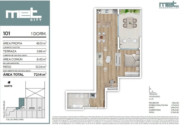 Venta de apartamento de 1 dormitorio en Met City, Centro, ubicado en Canelones, entre Héctor Gutiérrez Ruiz y Zelmar Michelini, en una zona hiperconectada, donde te facilita la logística cotidiana, con todos los servicios a mano y a su vez muy cerca del escape de la Rambla.