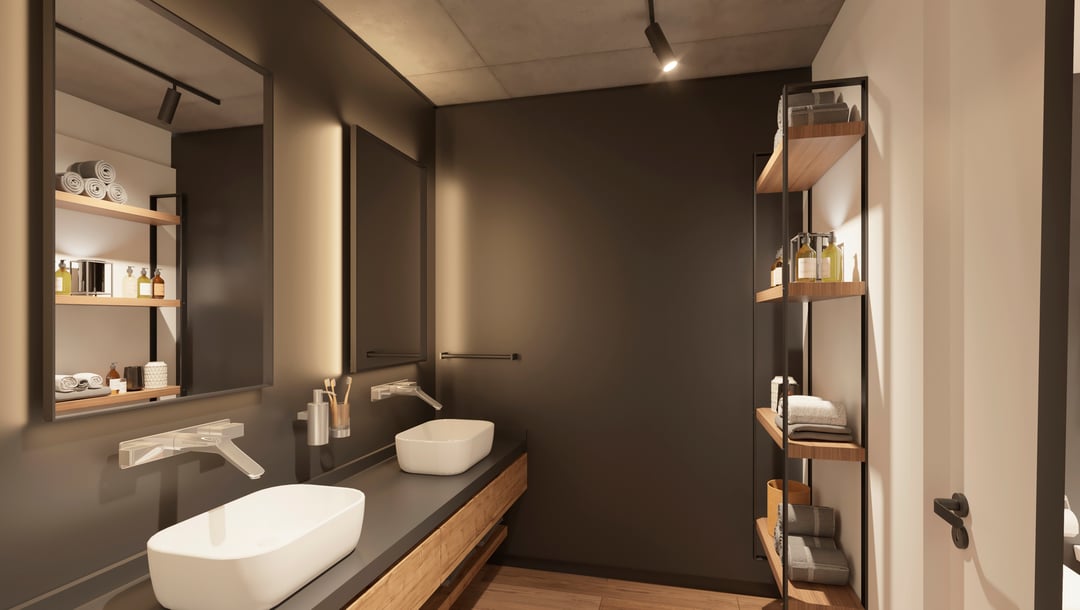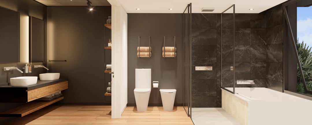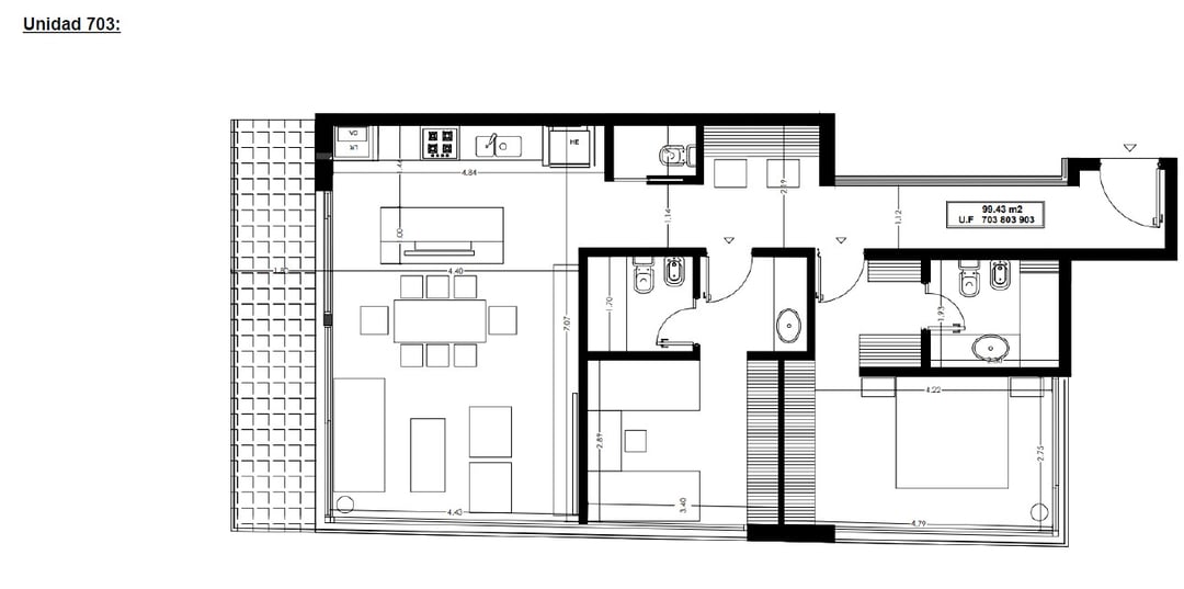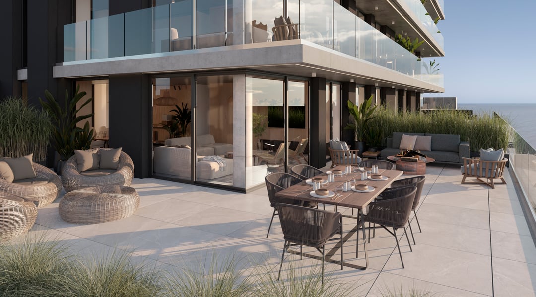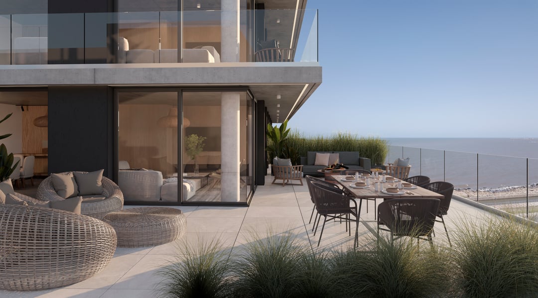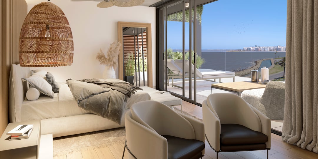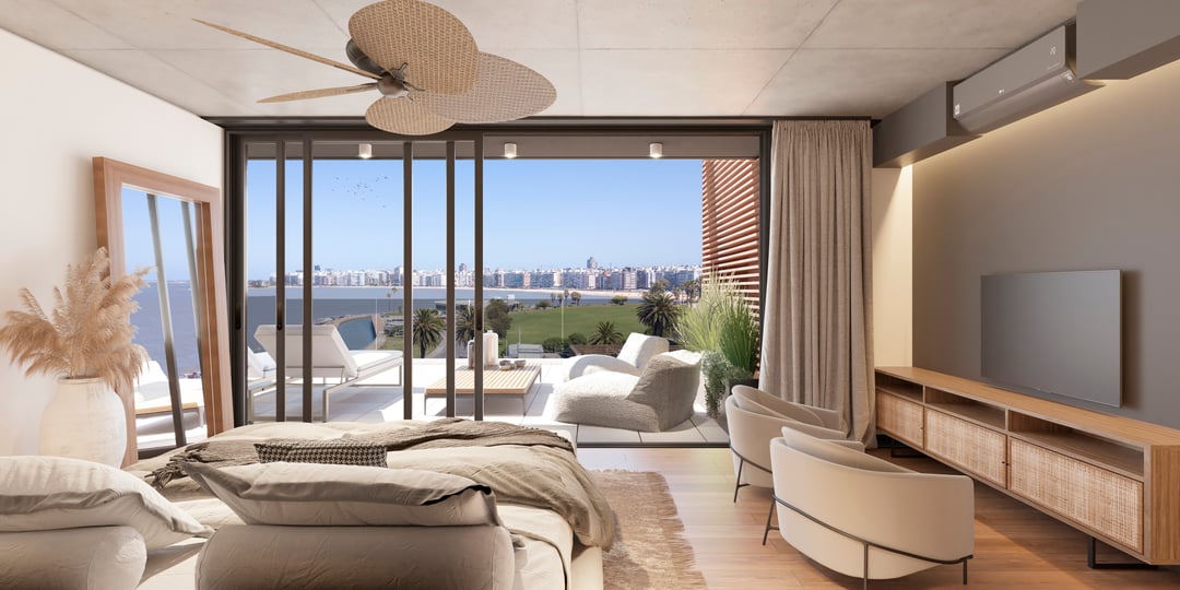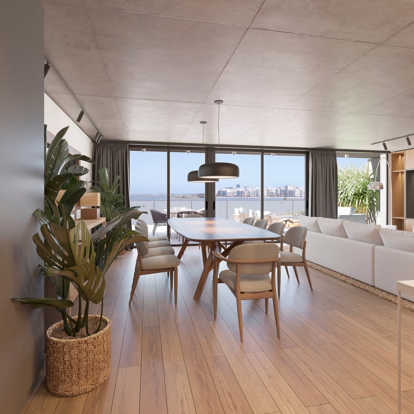 Barandas de balcones en doble vidrio templado con laminado de seguridad. Cuenta con losa radiante de calefacción.