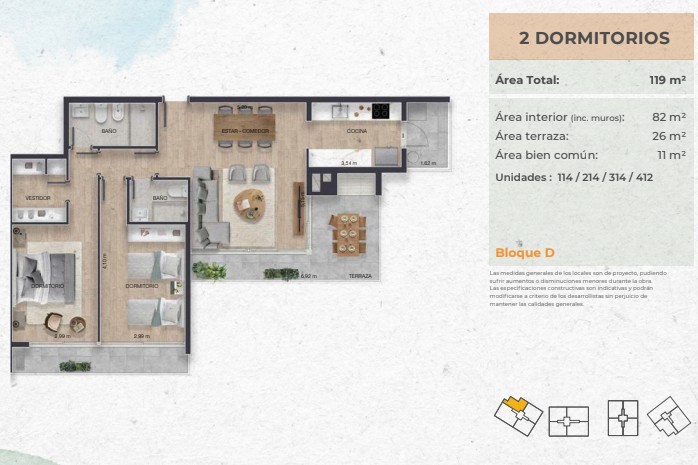 Tiene dos dormitorios, el principal en suite con vestidor, y ambos con acceso a una terraza. Además, incluye un baño completo y una terraza adicional con parrillero de uso exclusivo.